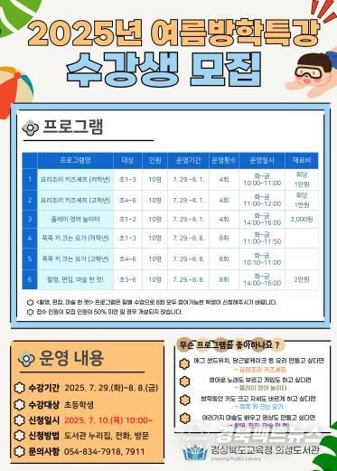 경북팩트뉴스 남유신 기자 | 경상북도교육청 의성도서관은 여름방학을 맞이하여 관내 초등학생을 대상으로 7월 29일부터 8월 8일까지 2주간 여름방학특강을 운영한다고 밝혔다.
