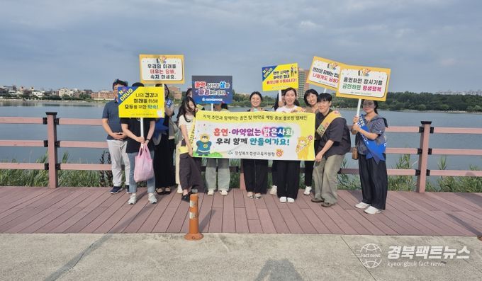 경북팩트뉴스 남유신 기자 | 경상북도경산교육지원청은 6월 26일 세계 마약 퇴치의 날을 맞아 경산 남매지 일원에서 학생 및 지역주민을 대상으로‘흡연 및 마약 예방 홍보 플로킹 캠페인’을 실시했다.