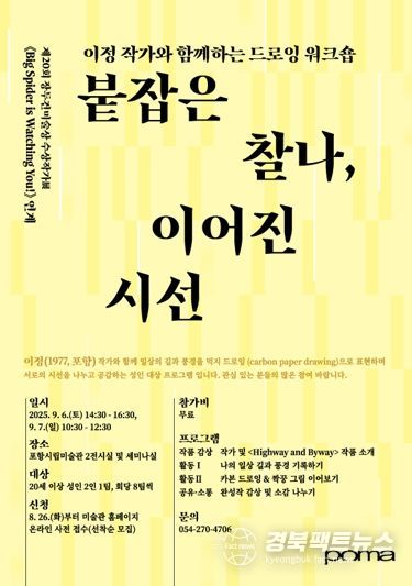 참가 접수는 26일 오전 10시부터 포항시립미술관 홈페이지에서 선착순으로 진행되며 자세한 문의는 포항시립미술관으로 하면 된다.