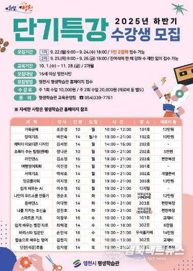 경북팩트뉴스 남유신 기자 | 영천시 평생학습관은 시민들이 다양한 배움을 통해 삶의 활력을 얻을 수 있도록 22일부터 ‘2025년 하반기 단기특강’ 수강생을 모집한다.