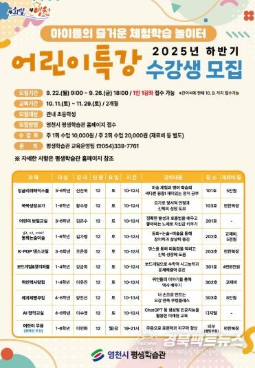 경북팩트뉴스 남유신 기자 | 영천시 평생학습관은 22일부터 26일까지 관내 초등학생을 대상으로 ‘2025년 하반기 어린이특강’ 수강생을 모집한다.