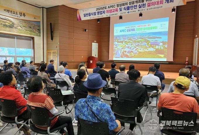 경북팩트뉴스 남유신 기자 | 경상북도는 18일 경주시 감포읍 복지회관에서 경주시 내 일반음식점 영업주와 종사자 등 200여 명이 참석한 가운데 ‘외식업 위생교육 및 식품안전 실천 결의대회’를 개최했다.