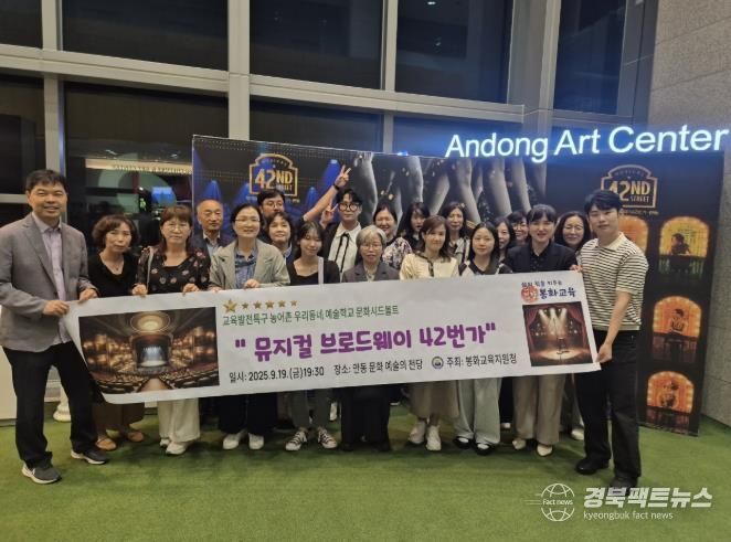 경북팩트뉴스 남유신 기자 | 경상북도봉화교육지원청은 9월 19일, 2025 농어촌 우리동네 예술학교 운영 관리자 및 담당 교사들이 안동문화예술의전당에서 열린 뮤지컬 『브로드웨이 42번가』 공연을 관람했다고 밝혔다.