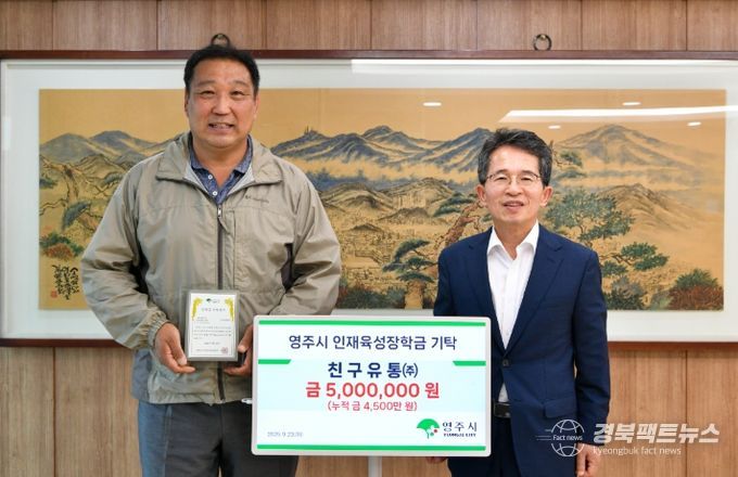 경북팩트뉴스 남유신 기자 | 재)영주시인재육성장학회는 지난 23일, 친구유통㈜(대표 하원태)로부터 지역 인재 양성을 위한 장학금 500만 원을 기탁받았다고 밝혔다.