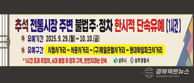 경북팩트뉴스 남유신 기자 | 상주시는 민족 고유의 명절인 추석을 맞아 전통시장 활성화와 귀성객들의 편의를 위해 전통시장 주변 불법주·정차 단속을 한시적으로 유예한다.