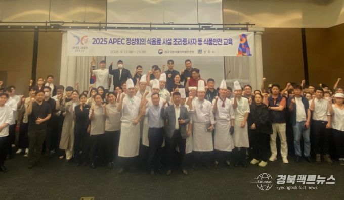 경북팩트뉴스 남유신 기자 | 경주시는 2025 APEC 정상회의를 앞두고 대구지방식품의약품안전청과 협력해 지난 22일부터 23일까지 양일간 더케이호텔 경주에서 식음료시설 조리종사자를 대상으로 위생‧안전 교육을 실시했다고 밝혔다.