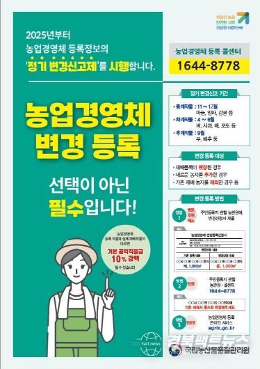 하지만 그동안 농업인들이 바쁜 영농활동과 제도에 대한 인식부족으로, 농업경영정보의 변경사항이 발생했음에도 불구하고 제때 변경등록을 하지 않고 있어, 농업경영체 등록정보의 정확도가 저하되고, 농업인도 기본형공익직불금 10% 감액 등 지원 사업에서 배제되는 등의 불이익을 받을 우려가 있다.