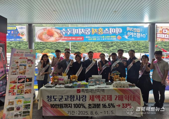 경북팩트뉴스 남유신 기자 | 청도군은 9월 25일 추석 명절 연휴를 맞아 귀성객이 집중되는 대구~부산 고속도로 청도 새마을 상·하행선 휴게소에서 ‘고향사랑기부제’홍보 캠페인을 펼쳤다.
