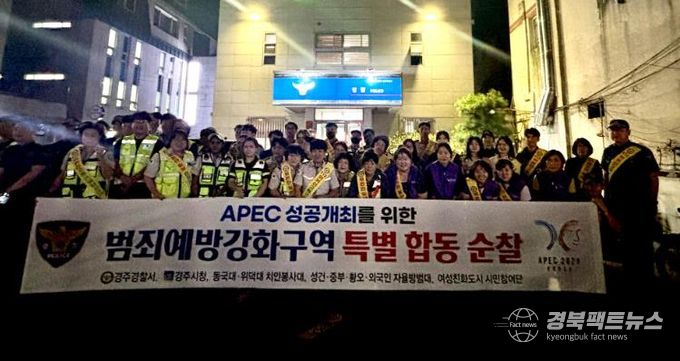 합동순찰에는 여성친화도시 시민참여단, 자율방범대, 외국인 유학생 치안봉사대, 경주시청, 경주경찰서 등 민·관·경이 함께 참여했다.