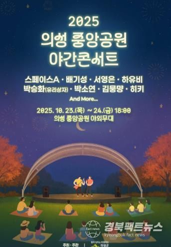 경북팩트뉴스 남유신 기자 | 의성군은 지난 7월 1일 개원한 도심 속 힐링공간 ‘의성 중앙공원’에서 오는 23일부터 24일까지 양일간 오후 6시에 ‘2025 의성 중앙공원 야간콘서트’를 개최한다고 밝혔다.