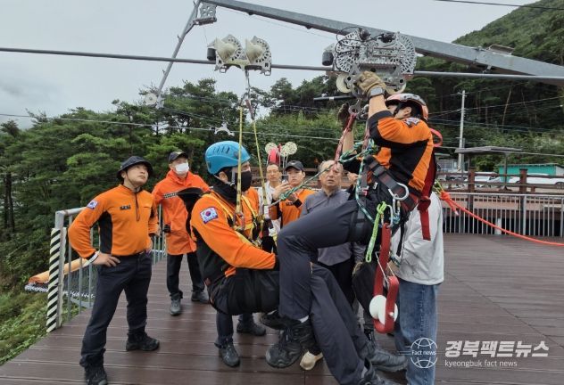 경북팩트뉴스 남유신 기자 | 영천시시설관리공단은 지난 14일 보현산댐 짚와이어에서 영천소방서 구조대와 합동으로 구조 훈련을 실시했다.