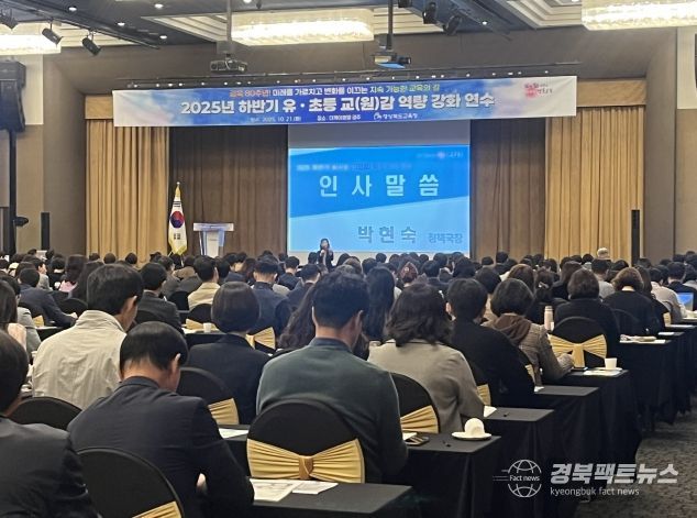 경북팩트뉴스 남유신 기자 | 경북교육청은 21일 경주시에 있는 더케이호텔경주에서 도내 유․초등 교(원)감 440여 명을 대상으로 ‘2025 하반기 유․초등 교(원)감 역량 강화 연수’를 개최했다고 밝혔다.