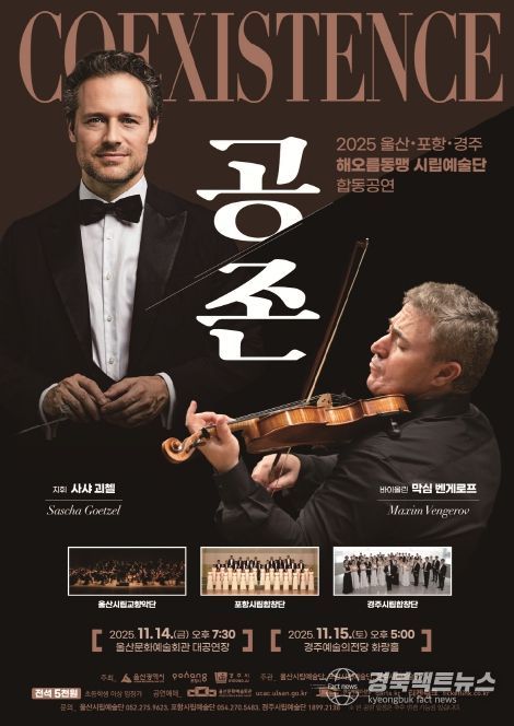 경북팩트뉴스 남유신 기자 | 울산광역시가 주관하는 ‘2025 해오름동맹 시립예술단 합동공연 '공존(COEXISTENCE)'’이 11월 14일 울산문화예술회관 대공연장, 11월 15일 경주예술의전당 화랑홀에서 잇따라 열린다.