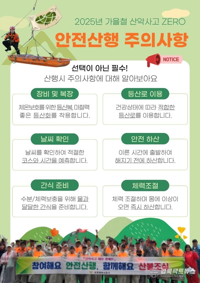 경북팩트뉴스 남유신 기자 | 포항북부소방서(서장 김장수)는 가을철 등산객 증가에 따라 산악사고 위험이 높아지고 있다며 시민들에게 각별한 주의를 당부했다.