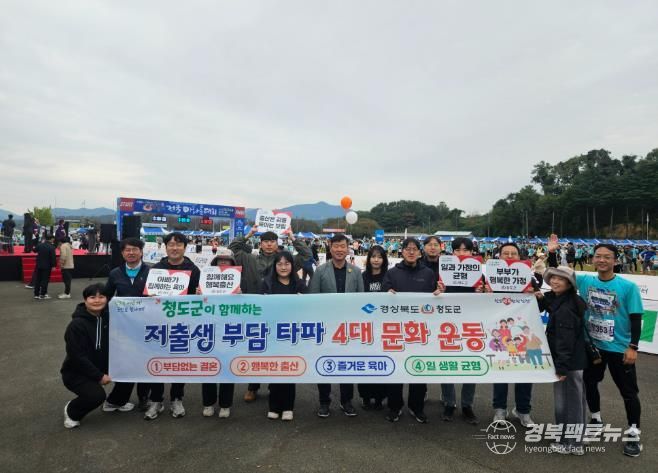 경북팩트뉴스 남유신 기자 | 청도군은 지난 26일 열린 ‘청도 반시 전국 마라톤 대회’ 현장에서 군민들과 전국 각지에서 모인 참가자들을 대상으로 저출산 부담 타파 4대 문화운동을 알리고 홍보하며 동참을 이끌었다.