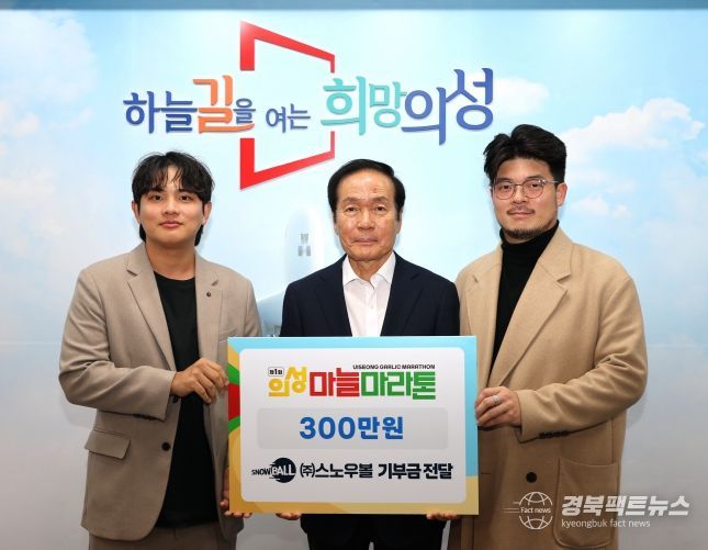 경북팩트뉴스 남유신 기자 | (재)의성군인재육성재단(이사장 김주수 의성군수)은 지난 10월 24일, 청년 창업기업 ㈜스노우볼(대표 이설)이 2025년 의성마늘마라톤대회 수익금 일부인 300만 원을 지역 인재육성을 위한 장학금으로 기탁했다고 밝혔다.