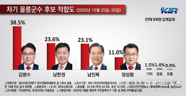 이번 조사는 영남이코노믹, 딜사이트경제TV 대구경북취재본부 공동으로 여론조사 기관 코리아정보리서치에 의뢰하여 10월25일부터 27일까지 3일간 울릉군 거주 만 18세 이상 남녀 509명을 대상으로, 무선전화 가상번호(80%)와 유선전화 RDD(20%)를 이용하여 자동 응답 방식으로 진행했다. 응답률은 무선전화 32.0%, 유선전화 12.5%이고, 표본오차는 95% 신뢰수준에 ±4.3%P다. 통계보정은 2025년 9월말 행정안전부 발표 주민등록 인구 기준 성, 연령, 지역별 셀가중값을 부여했다. 보다 자세한 내용은 중앙여론조사심의위원회 홈페이지를 참고하면 된다.