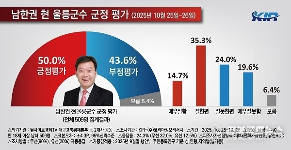 한편 남한권 현 울릉군수의 군정 평가 조사에서는 긍정 50.0%, 부정 43.6%로 나타났다.