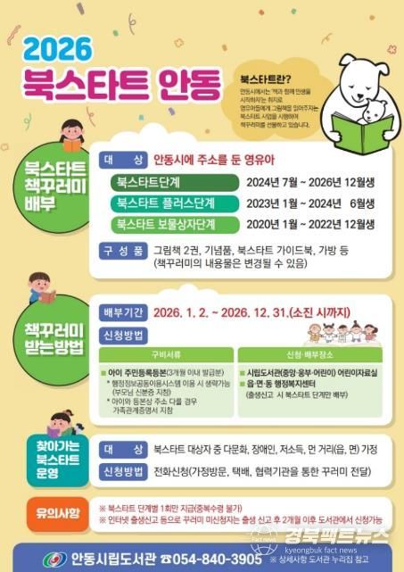 경북팩트뉴스 남유신 기자 | 안동시립도서관은 ‘책과 함께 인생을 시작하자’는 취지로 영유아에게 책꾸러미를 선물하는 독서문화 확산 사업 『북스타트 안동』을 올해도 추진한다고 1월 29일 밝혔다.