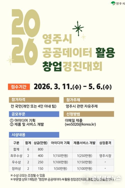 경북팩트뉴스 남유신 기자 | 영주시는 공공데이터 기반 창업을 촉진하기 위해 3월 11일부터 5월 6일까지 ‘2026년 영주시 공공데이터 활용 창업경진대회’ 참가자를 모집한다.