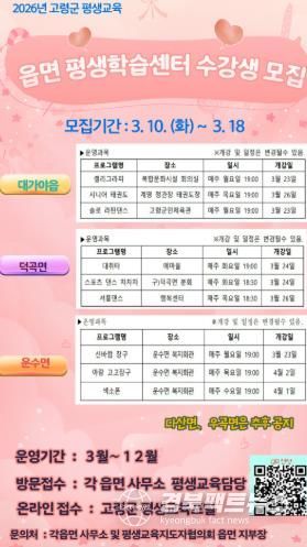 경북팩트뉴스 남유신 기자 | 고령군은 지역 주민들의 근거리 학습권을 보장하고 폭넓은 교육 기회를 제공하기 위해 3월 10일부터 18일까지 ‘2026년 읍·면 평생학습센터’ 수강생을 모집한다고 밝혔다.