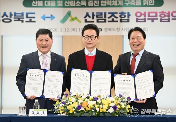 경북팩트뉴스 남유신 기자 | 경상북도는 3월 12일 도청 사림실에서 산림조합과 ‘산불 대응 및 산림소득 증진을 위한 업무협약(MOU)’을 체결하고 산림 재난 대응과 임산업 발전을 위한 협력체계를 구축했다.
