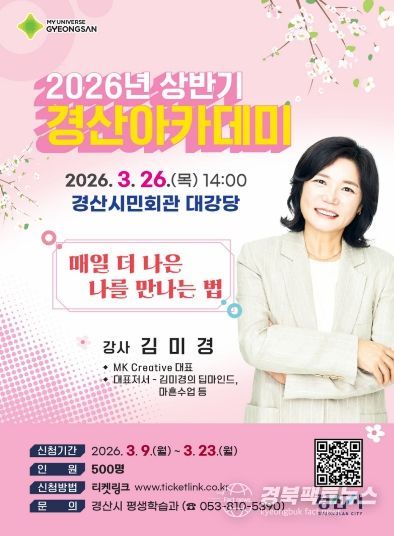 경북팩트뉴스 남유신 기자 | 경산시는 26일 경산시민회관 대강당에서 『2026년 상반기 경산 아카데미』를 개최할 예정이다. 이번 특강은 MK Creatice 대표 김미경 강사를 초청해‘매일 더 나은 나를 만나는 법’을 주제로 진행될 예정이다.