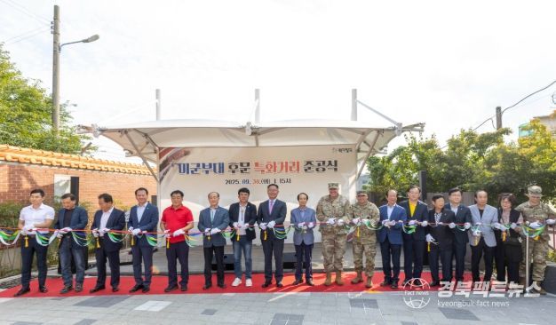 경북팩트뉴스 남유신 기자 | 칠곡군은 9월 30일 오후, 석전2리에서 ‘미군부대 후문 특화거리 준공식’을 열고 마을 발전의 새로운 출발을 알렸다. 이번 준공식에는 김재욱 칠곡군수, 이상승 칠곡군의회 의장, 배성도 칠곡군의회 부의장, 권선호 군의원, 구정회 군의원 등 주요 내빈을 비롯해 주민 200여 명이 참석해 자리를 빛냈다.