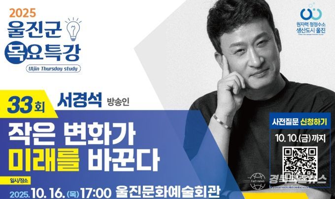 경북팩트뉴스 남유신 기자 | 울진군은 오는 10월 16일 오후 5시 후포면 울진문화예술회관에서 제33회 울진군 목요특강을 개최한다.
