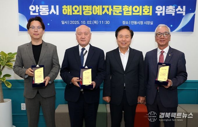경북팩트뉴스 남유신 기자 | 안동시는 10월 2일 해외명예자문협의회 자문위원 3명에 대한 추가 위촉식을 개최했다. 해외명예자문협의회는 해외에서 활발하게 활동하는 한인 인사 8명으로 구성됐으며 임기는 2027년 4월까지 2년이다. 이들은 안동시와 세계 각국을 연결하는 가교로서, 국제교류․협력 확대에 핵심적인 역할을 맡게 된다.