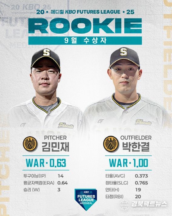 경북팩트뉴스 남유신 기자 | 2025 메디힐 KBO 퓨처스리그의 9월 퓨처스 루키상 수상자로 투수 부문에는 상무 김민재가 WAR 0.63, 타자 부문에는 상무 박한결이 WAR 1.00을 기록하며 각각 선정됐다.