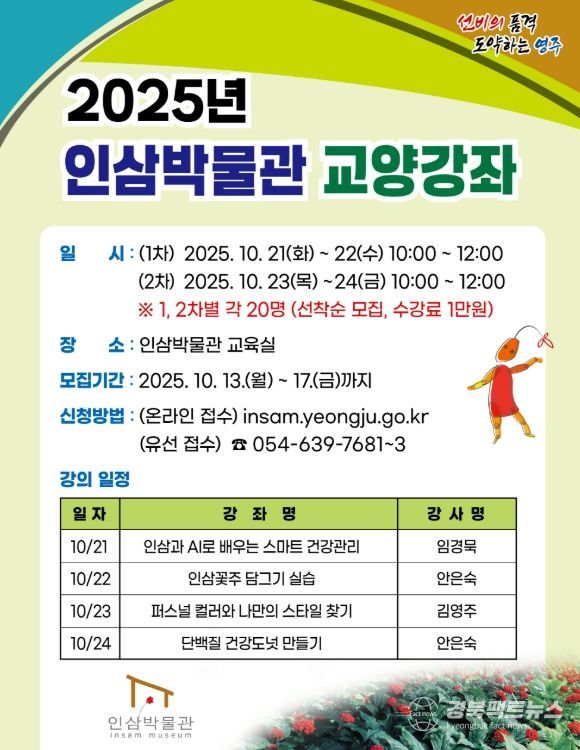 경북팩트뉴스 남유신 기자 | 영주시 인삼박물관은 2025 영주 풍기인삼축제와 연계해 오는 10월 21일부터 24일까지 시민을 대상으로 생활 속 건강과 문화를 접목한 특별 교양강좌를 운영한다.