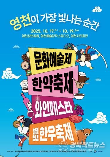 올해는 오는 17일부터 19일까지 3일간 강변공원에서 ▲제23회 한약축제 ▲제51회 문화예술제 ▲제13회 와인페스타 with 별빛한우 명품구이축제 등 영천시 주요 축제를 공동 개최한다. 영천예술상 시상식과 추억사랑희망 콘서트 등 공연은 시민회관에서, 수석전·민화전 등 전시회는 예술창작스튜디오에서 열린다.