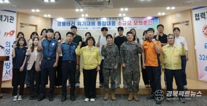 경북팩트뉴스 남유신 기자 | 의성군은 지난 9월 29일 의성군보건소 주관으로 의성경찰서, 의성소방서, 의성군부대 관계자 등 25명이 참여한 가운데 생물테러 위기대비 통합대응 소규모 모의훈련을 실시했다.