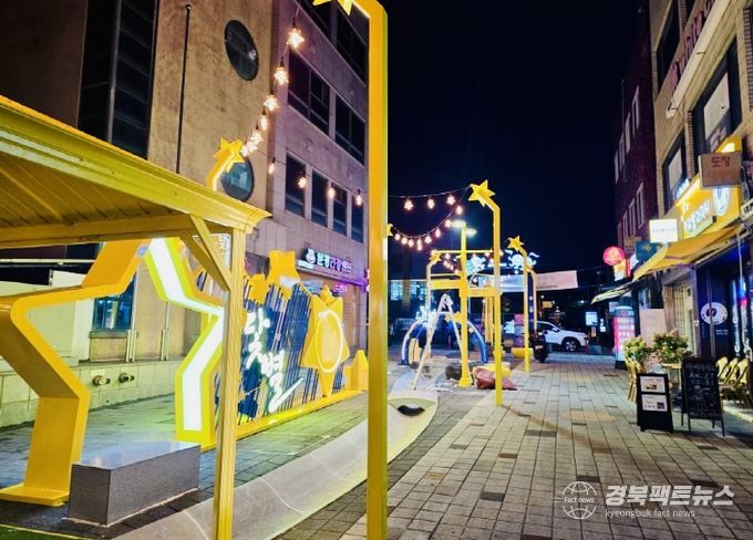 경북팩트뉴스 남유신 기자 | 문경시는 점촌원도심상권 130m 구간에 노란색 간판과 어닝을 새로 달고, 상징 조형물 13점, 조형벤치 20개를 설치했으며, 은하수 조명 18m와 360여 개의 파티등으로 ‘닻별 테마길’을 화려하게 완공했다.