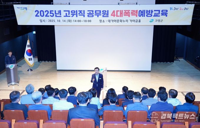 경북팩트뉴스 남유신 기자 | 고령군은 14일 문화누리 가야금홀에서 이남철 군수를 비롯한 고위직 공무원 37명을 대상으로 4대 폭력(성희롱, 성폭력, 성매매, 가정폭력) 예방교육을 실시했다.