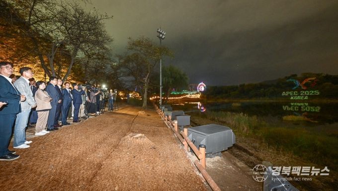 경북팩트뉴스 남유신 기자 | 경상북도와 경주시는 15일 저녁, 보문관광단지 육부촌과 호반 광장 일원에서 이철우 도지사, 주낙영 경주시장 등 주요 내빈과 시민 100여 명이 참석한 가운데, APEC 보문단지 야간경관 개선사업 '빛의 향연' 시연회를 개최했다.