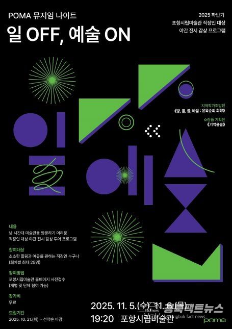 경북팩트뉴스 남유신 기자 | 포항시립미술관은 오는 11월 5일부터 6일까지 양일간 직장인을 대상으로 한 야간 전시 감상 프로그램 ‘POMA 뮤지엄 나이트: 일 OFF, 예술 ON’을 운영한다.