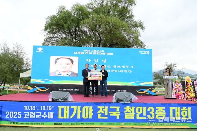 경북팩트뉴스 남유신 기자 | 10월 19일 세무법인 팔공 차길녕 대표세무사가 ‘2025 고령군수배 대가야 전국 철인3종 대회’ 개막식에서 지역의 교육 발전과 인재 양성을 위해 사용해 달라며 교육발전기금 500만원을 기탁했다.
