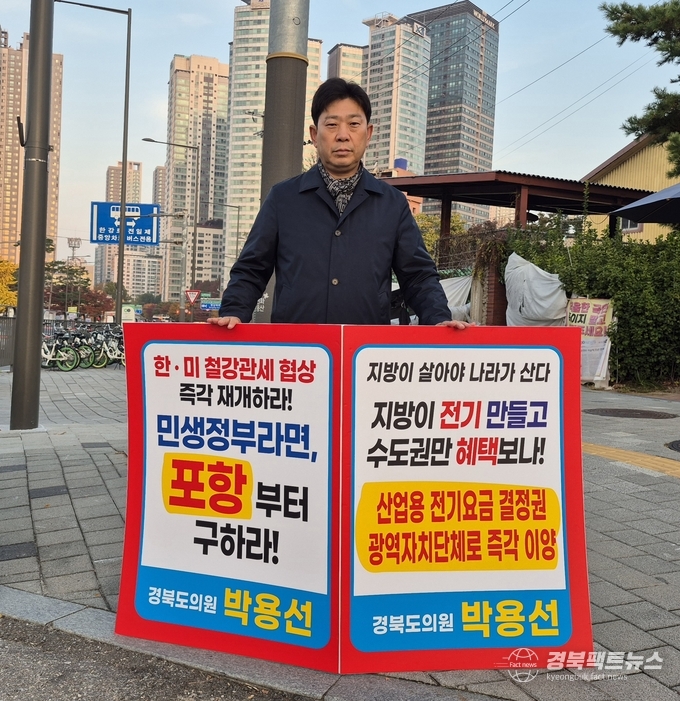 경북팩트뉴스 남유신 기자 | 경북도의회 박용선 의원이 6일 오전 서울 용산 대통령실 인근(전쟁기념관 2게이트 일대)에서 ‘한·미 철강관세 협상 즉각 재개’를 촉구하며 1인 시위를 벌였다.