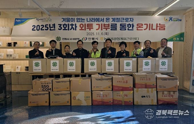 이날 행사에는 박정숙 안동시4-H본부 회장과 회원을 비롯해 신정식 안동와룡농협 조합장 등이 참여해, 안동시에서 근무 중인 공공형 외국인 계절근로자에게 겨울옷 1,000여 벌을 전달하며 따뜻한 마음을 나눴다.