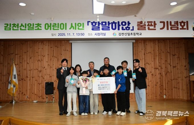 경북팩트뉴스 남유신 기자 | 김천복지재단(이사장 배낙호)은 지난 7일, 김천 신일초등학교(교장 채득원) 어린이 작가 22명으로부터 시집 『할말하않』 출판 수익금 성금 30만 원을 전달받았다고 밝혔다.