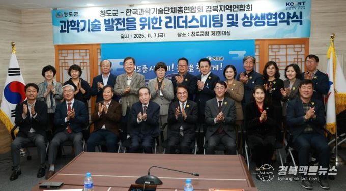 경북팩트뉴스 남유신 기자 | 청도군과 한국과학기술단체총연합회 경북지역연합회는 7일 청도군청 제1회의실에서 청도군 간부공무원과 경북지역연합회 임원 등 30여 명이 참석한 가운데 ‘경북 과학기술 발전을 위한 리더스미팅’을 개최했다.