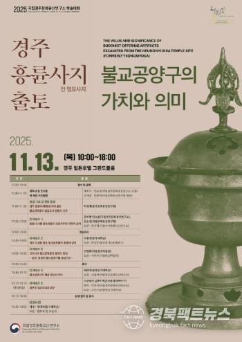 경북팩트뉴스 남유신 기자 | 국가유산청 국립문화유산연구원 국립경주문화유산연구소는 오는 11월 13일 오전 10시 경주 힐튼호텔 그랜드볼룸에서 '경주 흥륜사지(전 영묘사지) 출토 불교공양구의 가치와 의미' 학술대회를 개최한다.