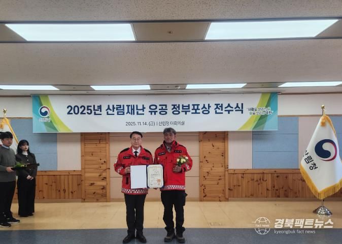 경북팩트뉴스 남유신 기자 | 영덕군 산불진화대장 김영수(58)씨가 14일 산림청에서 열린 ‘2025년 산림재난 유공자 포상식’에서 대통령 표창을 받았다.