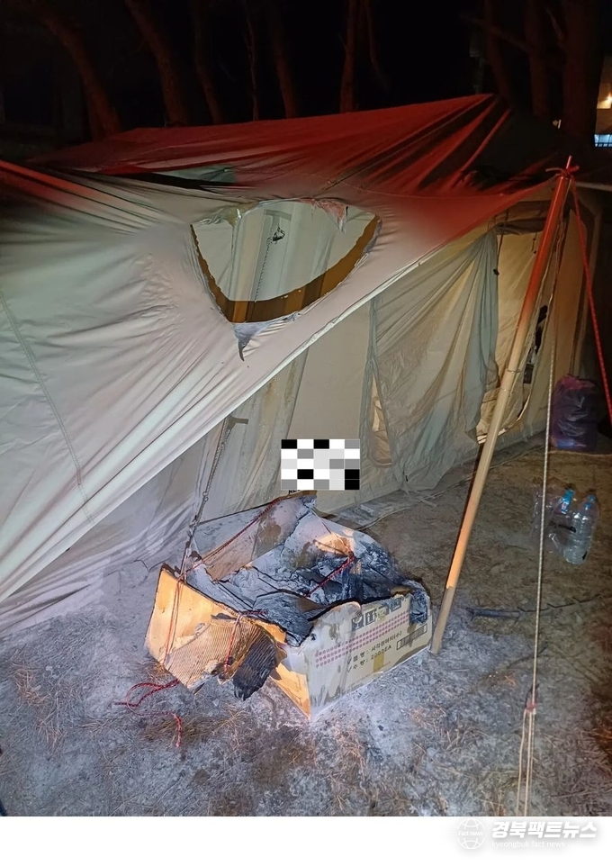 경북팩트뉴스 남유신 기자 | 포항북부소방서(서장 김장수)는 지난 15일 밤 10시 33분경 송라면 화진해수욕장 인근 공터에서 캠핑 중 부주의로 인한 화재가 발생함에 따라, 가을철 캠핑을 즐기는 시민들에게 각별한 주의를 당부했다.