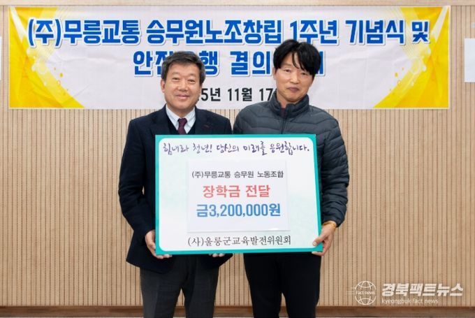 경북팩트뉴스 남유신 기자 | 지난 17일, 주식회사 무릉교통 승무원노동조합은 (사)울릉군교육발전위원회에 지역 학생들의 꿈을 응원하는 마음을 담아 장학금 320만 원을 기탁했다.