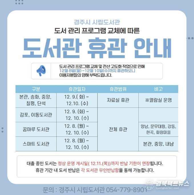 경북팩트뉴스 남유신 기자 | 경주시립도서관 본관과 분관, 꿈마루도서관이 도서 관리 프로그램 교체 및 전산 환경 개선 작업으로 12월 8일부터 10일까지 3일간 휴관한다.