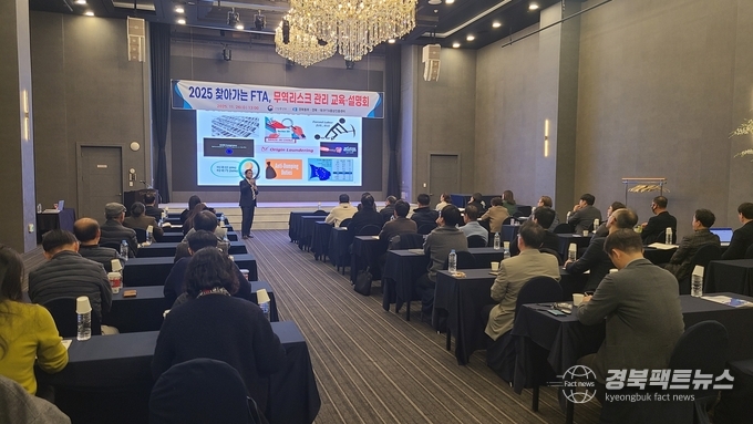 경북팩트뉴스 남유신 기자 | 포항상공회의소(회장 나주영) 경북동부FTA통상진흥센터는 26일 오후 1시 대구 그랜드호텔에서 경북·대구지역 수출기업들의 무역 부담을 완화하기 위해 ‘찾아가는 FTA, 무역리스크 관리 교육 및 설명회’를 개최했다.