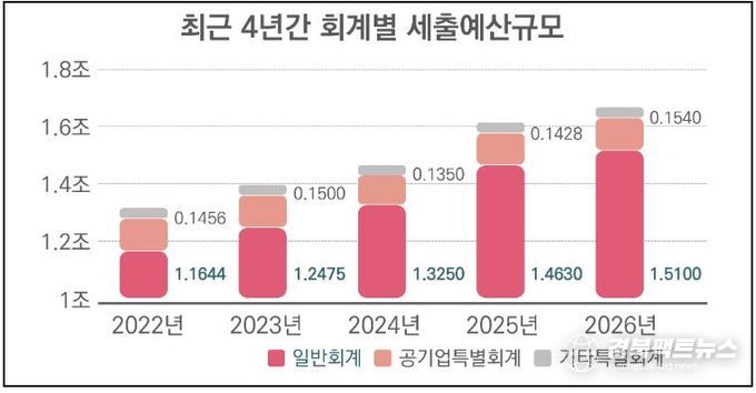회계별 세출예산 규모를 살펴보면 일반회계는 1조 1,644억 원에서 1조 5,100억 원으로 3,456억 원(29.7%) 늘어났고, 특별회계는 1,456억 원에서 1,540억 원으로 84억 원(5.8%) 증가했다.
